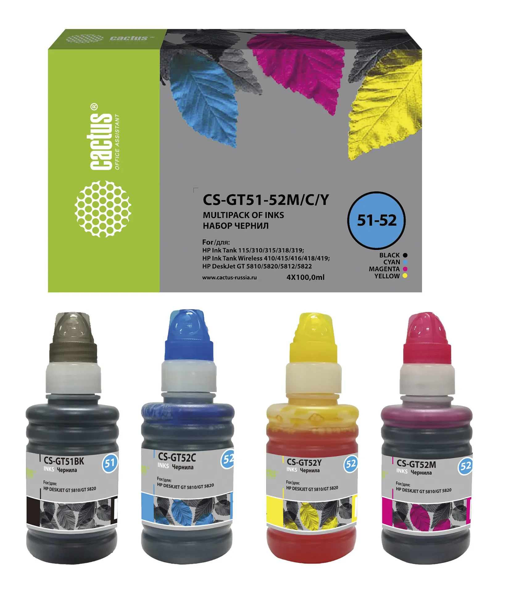 Комплект совместимых чернил Cactus GT51-GT52 (M0H57AE / M0H54AE / M0H55AE / M0H56AE) предназначен для заправки струйных принтеров HP с системой непрерывной подачи чернил (СНПЧ). В комплект входит 4 контейнера чернил на водной основе по 100 мл каждый. Контейнеры с чернилами имеют специальную форму носика, который обеспечивает пользователям лёгкость заправки чернильных емкостей, а также защищает от случайного проливания. Совместимы с устройствами: HP DeskJet GT 5810 (X3B11A), GT 5820 (X3B09A), HP Ink Tank 115, 310, 315, 319 AiO, 410 Wireless, 415, 419 Wireless AiO, HP Smart Tank 515.