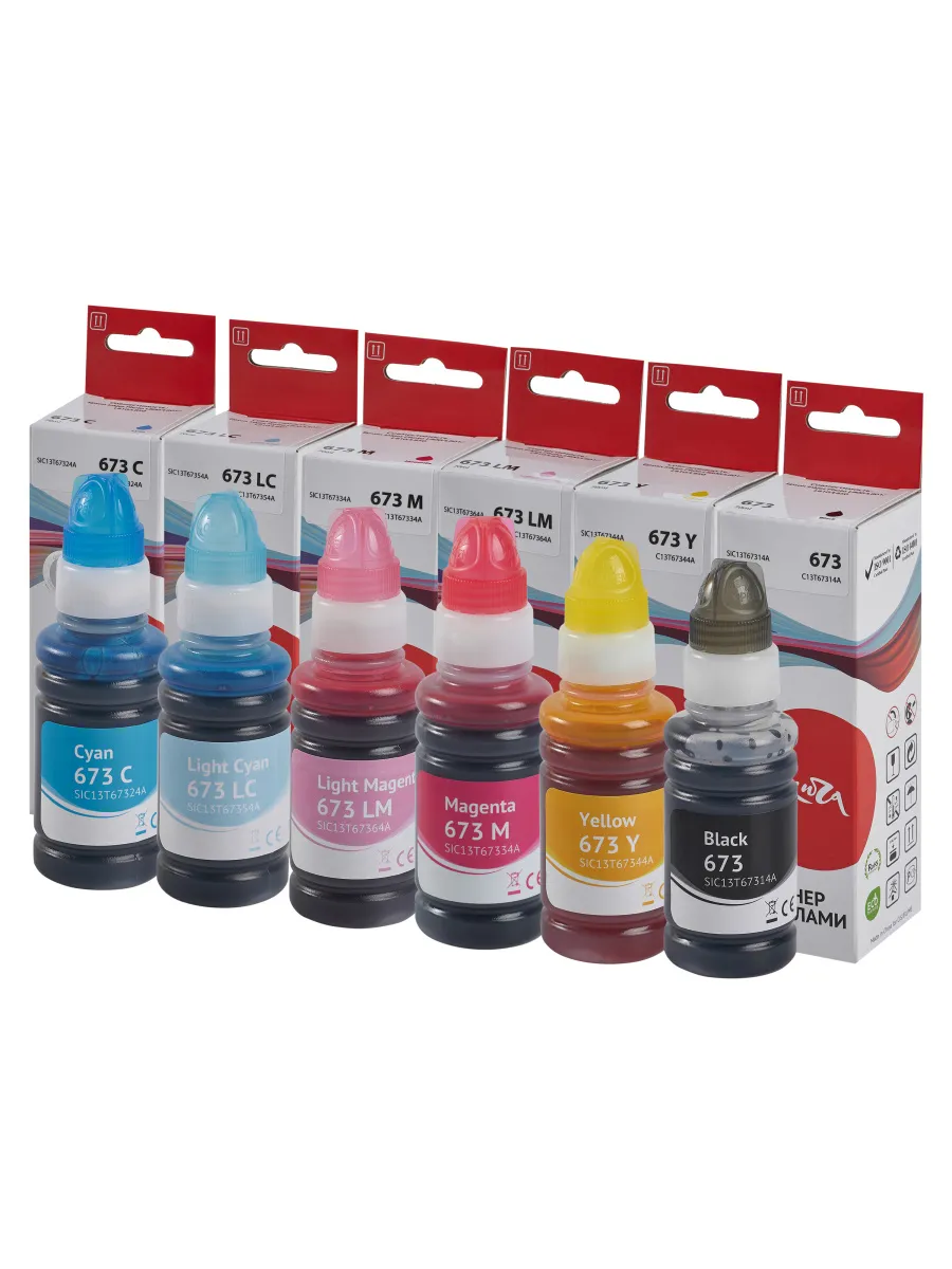 Набор чернил Sakura SIC13T673BA предназначен для струйных принтеров Epson Inkjet Photo L800, L801, L810 и L850. В набор входят шесть контейнеров объёмом 70 мл с чернилами чёрного, голубого, пурпурного, жёлтого, светло-голубого и светло-пурпурного цвета. Эти чернила обеспечивают высокое качество печати и яркие, насыщенные цвета.