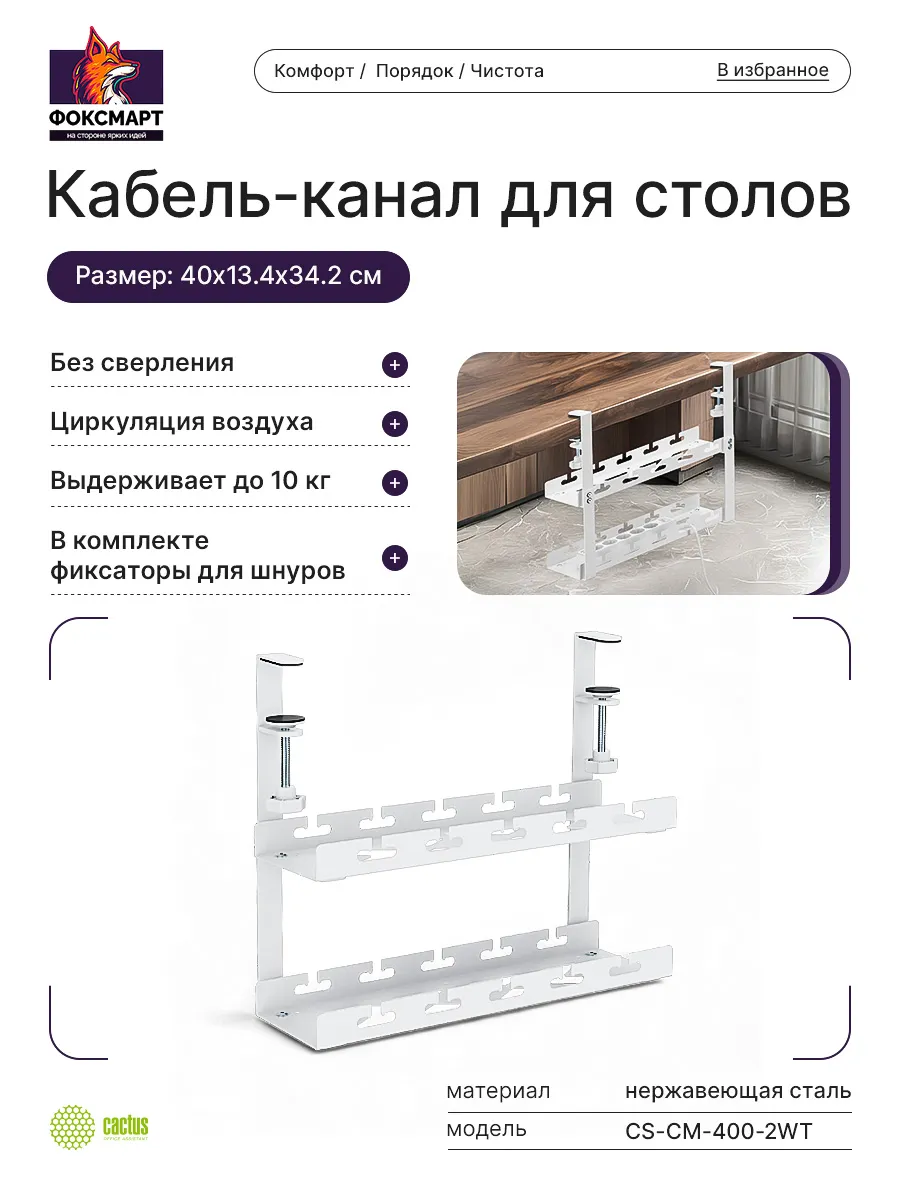 Кабель-канал с подстольным размещением позволит спрятать провода и навести порядок не только на столе, но и под ним, создавая условия для лёгкого доступа ко всем подключённым устройствам. Открытая конструкция обеспечивает вентиляцию, помогая избежать перегрева, а с помощью специального зажима, кабель-канал можно легко и надежно зафиксировать под столешницей. Данный продукт послужит отличным дополнением для компьютерных и игровых столов Cactus, независимо от сложности организации рабочего места.