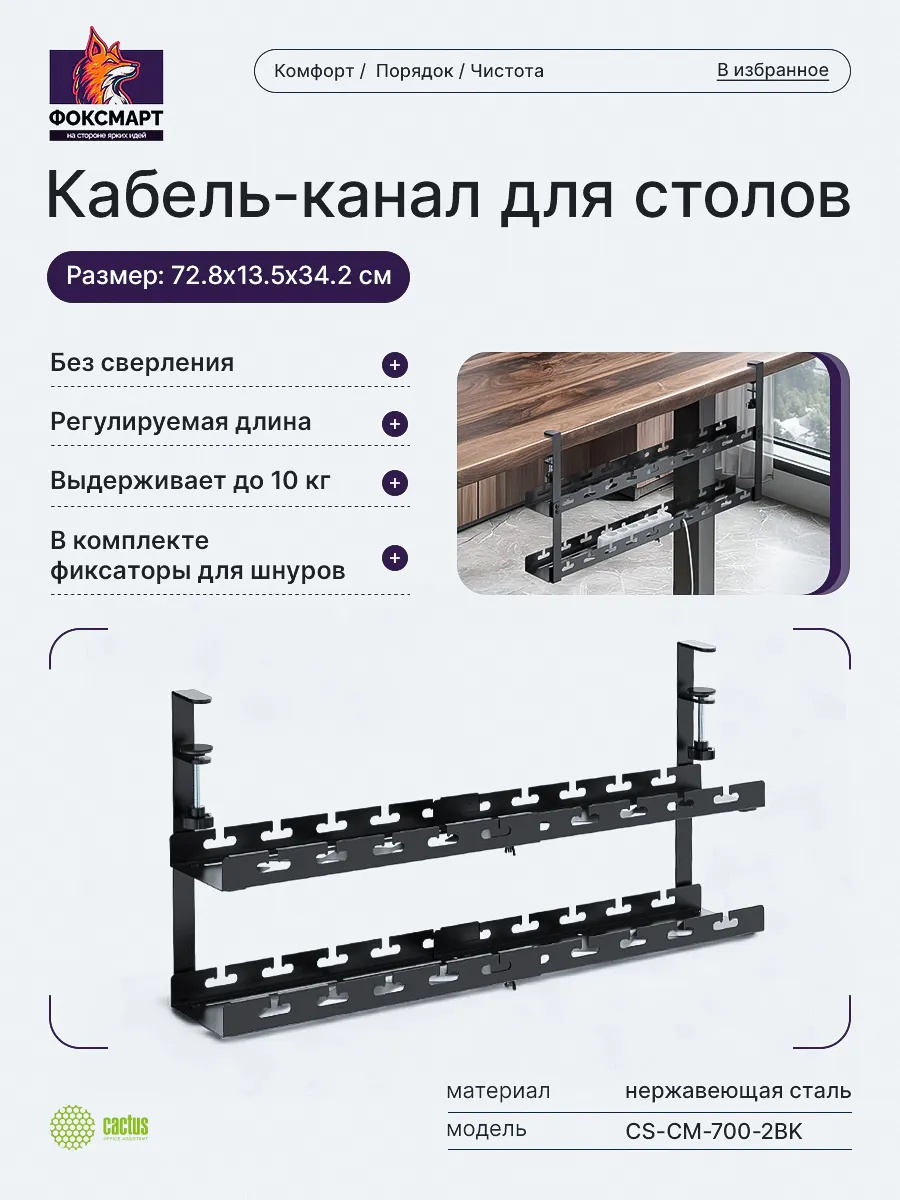 Кабель-канал с подстольным размещением позволит спрятать провода и навести порядок не только на столе, но и под ним, создавая условия для лёгкого доступа ко всем подключённым устройствам. Открытая конструкция обеспечивает вентиляцию, помогая избежать перегрева, а с помощью специального зажима, кабель-канал можно легко и надежно зафиксировать под столешницей. Данный продукт послужит отличным дополнением для компьютерных и игровых столов Cactus, независимо от сложности организации рабочего места.