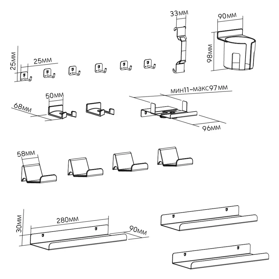 Набор аксессуаров CS-GMPB-SET1 станет отличным дополнением к перфорированным панелям Cactus. Большое количество различных крючков, удобный подстаканник, длинные полки для разных мелочей, отдельная раздвигаемая полочка для игр и универсальный крепёж для клавиатуры – всё это поможет в поддержании порядка на рабочем столе. Аксессуары легко и надёжно крепятся к панели, а стильный чёрный цвет отлично подойдёт к любому интерьеру.