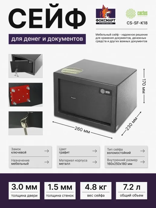 Сейф мебельный Cactus CS-SF-K18. Наличие «сейфов», стоящих в многочисленных офисах и домах это необходимость наших дней. Хранение ценных вещей, бумаг и денежных средств должно быть надежным.Сейфы изготавливаются из высококачественной стали с применением порошковой покраски в классический и лаконичный цвет – графит, который идеально впишется в любой интерьер.