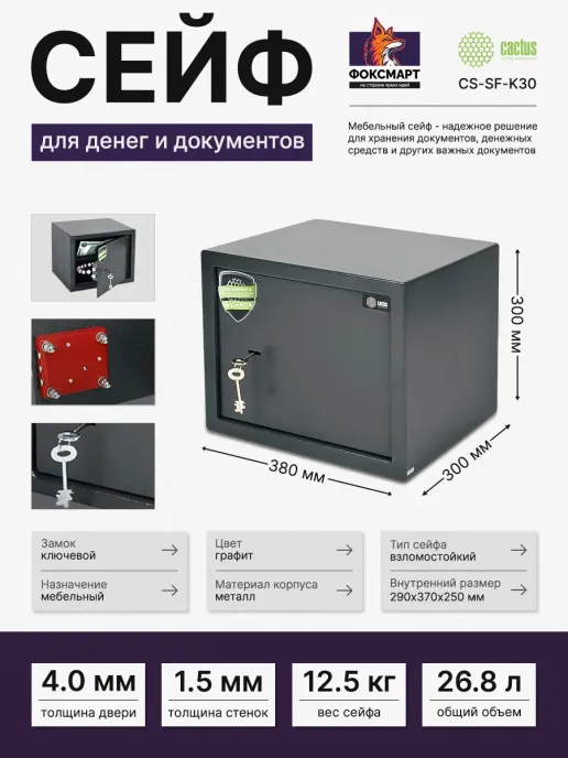 Сейф мебельный Cactus CS-SF-K30. Наличие сейфов, стоящих в многочисленных офисах и домах это необходимость наших дней. Хранение ценных вещей, бумаг и денежных средств должно быть надежным.# Сейфы изготавливаются из высококачественной стали с применением порошковой покраски в классический и лаконичный цвет-графит, который идеально впишется в любой интерьер.