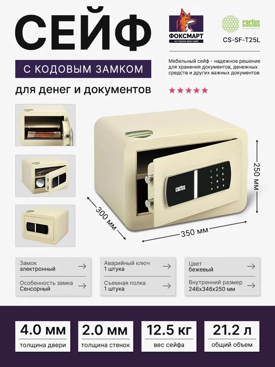 Сейф мебельный Cactus CS-SF-T25L. Наличие сейфов, стоящих в многочисленных офисах и домах – это необходимость наших дней. Новый сейф Cactus в бежевом цвете - это не инородный предмет в интерьере, а его стильная часть. Нестандартный светлый цвет окраски корпуса - удачное решение для кабинетов и офисов с обстановкой из мебели светлых цветов.