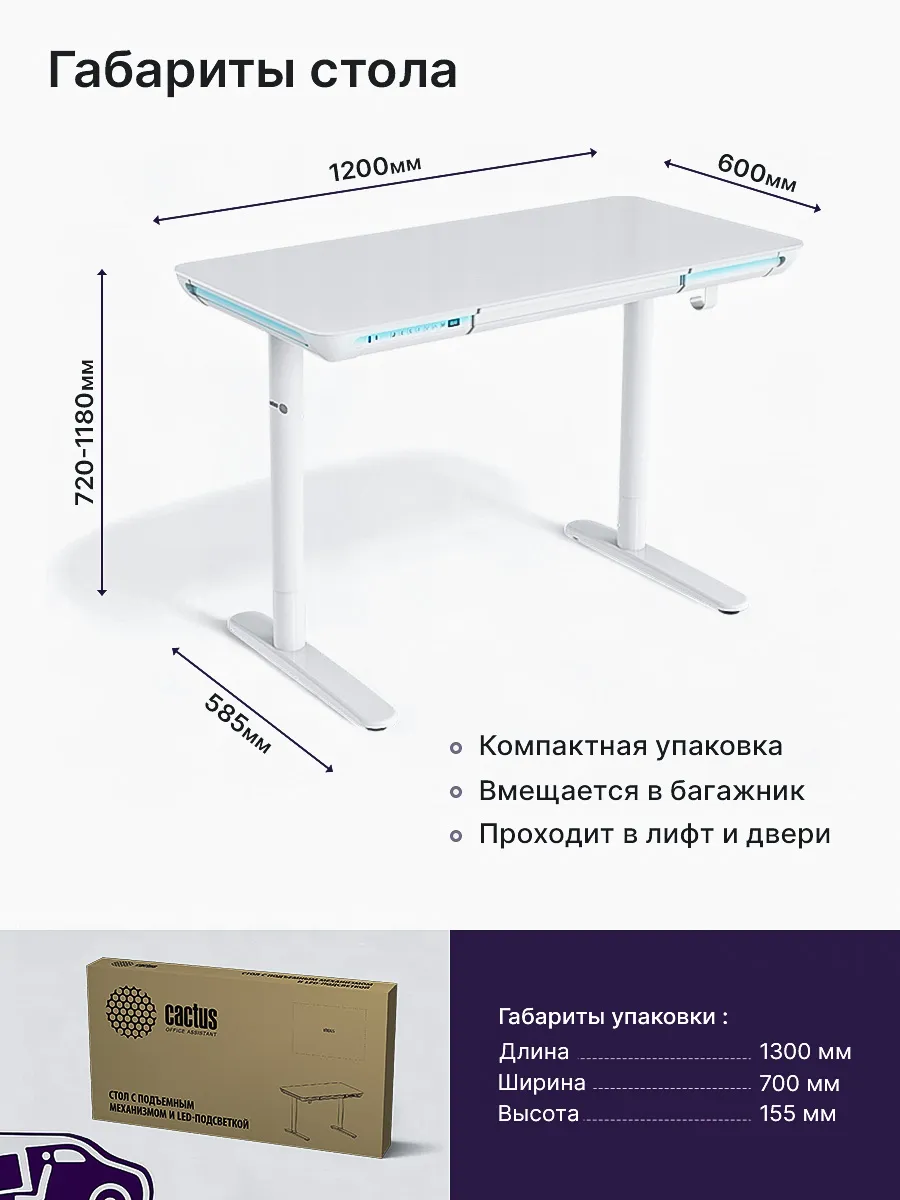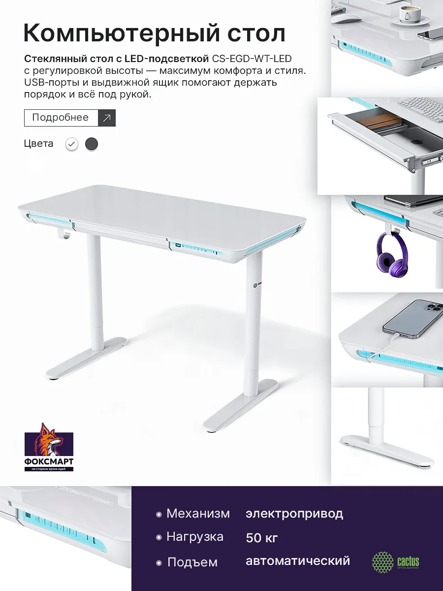 Стол для компьютера CS-EGD-WT-LED от CACTUS – это стильное и функциональное решение для современного офиса или домашнего кабинета. Его прямоугольная столешница из закаленного стекла придает модели элегантный вид, а прочная металлическая конструкция гарантирует надежность и долговечность. Стол оснащен удобным выдвижным ящиком для хранения необходимых мелочей, а также держателем для наушников, что добавляет комфорта во время работы. Главной особенностью модели является наличие подъемного механизма, позволяющего регулировать высоту стола под ваш рост, что обеспечивает эргономичное рабочее место и заботится о вашем здоровье. Кроме того, стол CS-EGD-WT-LED оснащен стильной подсветкой, создающей приятную атмосферу и подчеркивающую современный дизайн модели.