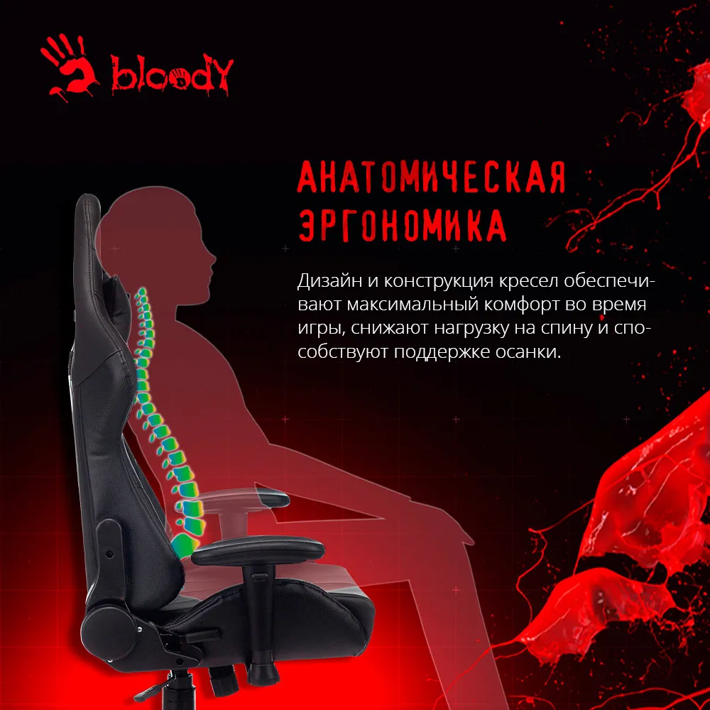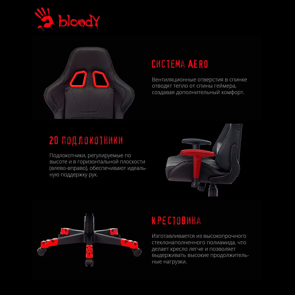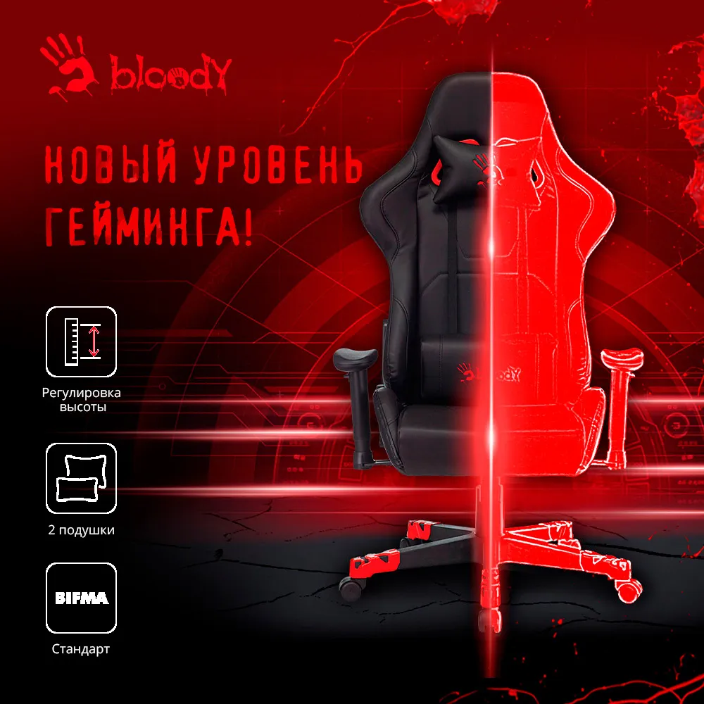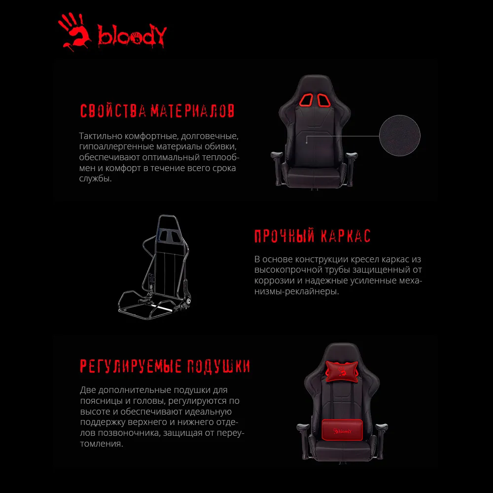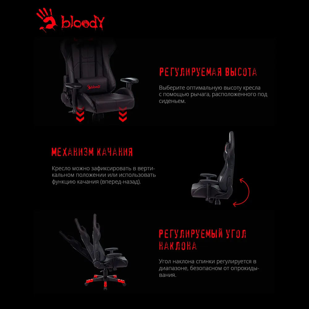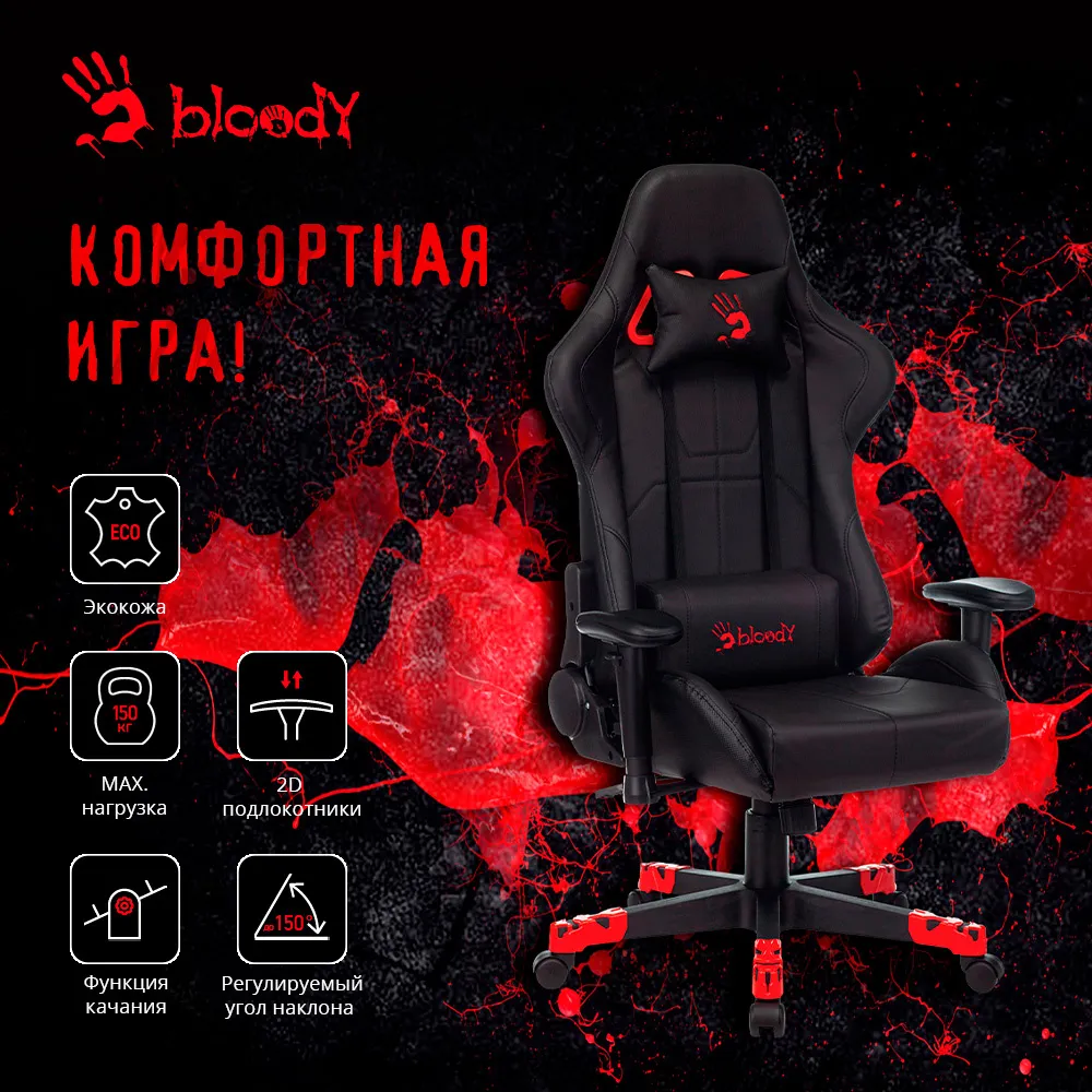 Кресло игровое A4Tech Bloody GC-550 черного цвета с обивкой из эко. кожи представляет собой комфортное и стильное решение для игроков и офисных работников. Это кресло способно выдерживать максимальную нагрузку до 150 кг, что делает его универсальным выбором для широкого круга пользователей. Колеса и крестовина изготовлены из прочного пластика, обеспечивая долговечность и удобство перемещения. Подлокотники с регулировкой в двух измерениях (2D) позволяют адаптировать кресло под индивидуальные потребности пользователя, что особенно важно для длительных игровых сессий или работы за компьютером. Кресло оснащено подголовником, который можно регулировать по высоте, а также имеет возможность наклона спинки и изменения высоты сиденья, что позволяет достичь оптимального положения тела для поддержания здоровья спины. Тип механизма с фиксацией в вертикальном положении обеспечивает устойчивость и надежность кресла в любой ситуации. Важно отметить, что для полного использования всех возможностей кресла требуется сборка, ко