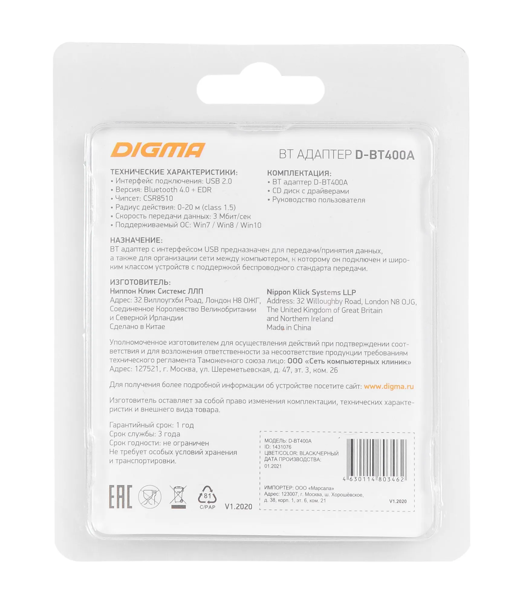 Адаптер USB Digma D-BT400A — это Bluetooth-адаптер версии 4.0 с поддержкой EDR класса 1.5 и радиусом действия до 20 метров. Он совместим с операционными системами Windows 7, 8, 10. Подключение осуществляется через интерфейс USB Type-A. Адаптер предназначен для беспроводного обмена данными между компьютером и совместимыми устройствами, такими как наушники, клавиатуры, мыши и другие периферийные устройства.