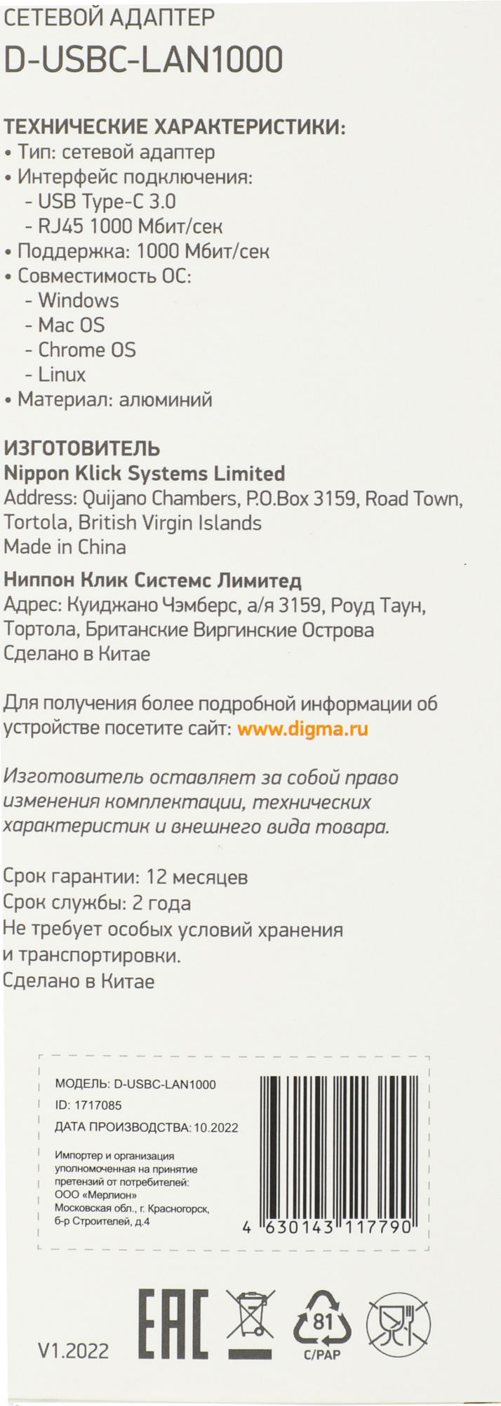 Сетевой адаптер Gigabit Ethernet D-USBC-LAN1000 от Digma - это надежное решение для подключения устройств с USB Type-C к проводной сети Ethernet. Этот компактный адаптер обеспечивает скорость передачи данных до 1000 Мбит/с, что позволяет наслаждаться быстрым и стабильным доступом к интернету. Он идеально подходит для подключения игровых консолей, ноутбуков, плееров и других устройств, оснащенных портом USB Type-C. D-USBC-LAN1000 прост в использовании: просто подключите его к устройству и к сетевому кабелю. Его компактный размер и прочный корпус делают его идеальным для использования дома, в офисе или в дороге.