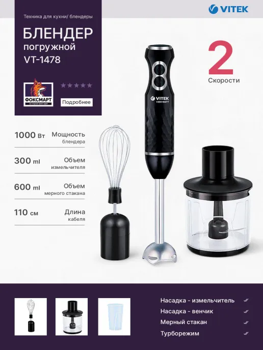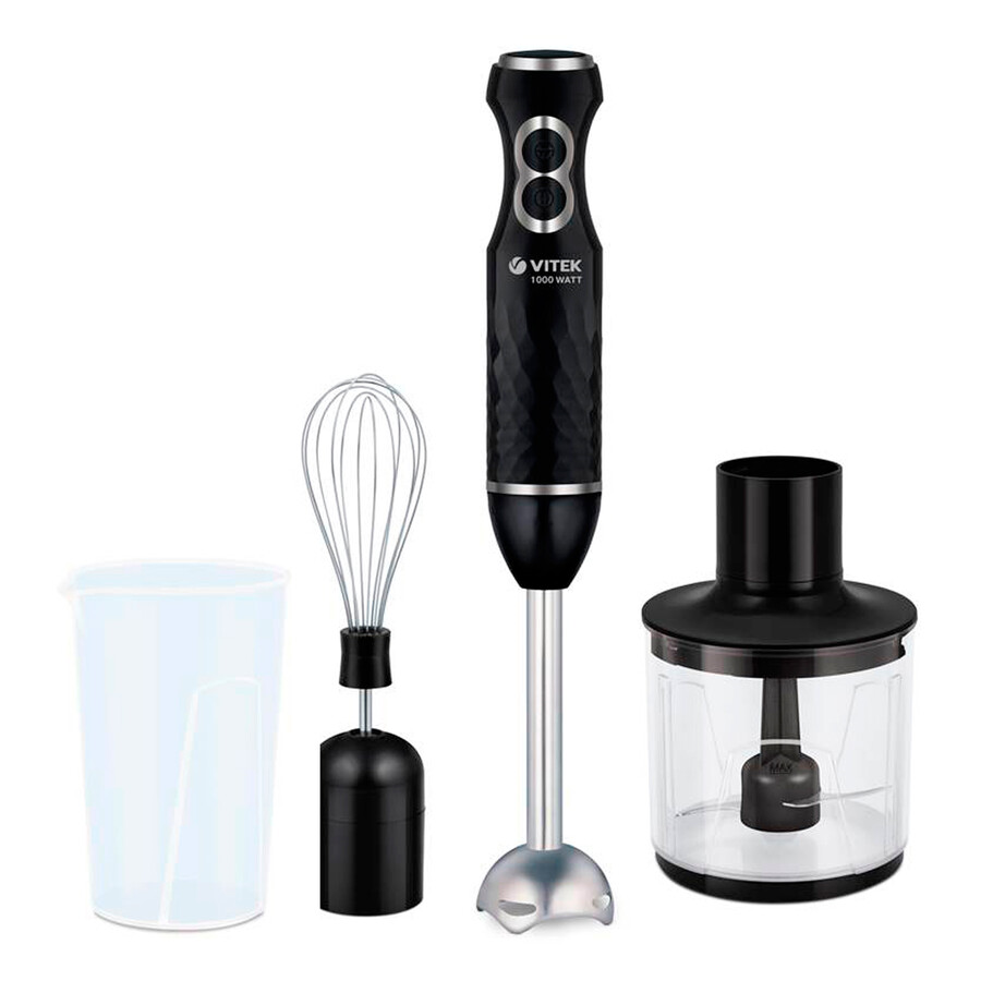 Блендерный набор VITEK VT-1478 с максимальной мощностью 1000 Вт поможет быстро и эффективно приготовить коктейль или смузи, пюрировать суп, измельчить до гладкости составляющие соуса. Погружная часть прибора, насадка-венчик для взбивания, а также лезвия для измельчения продуктов выполнены из нержавеющей стали, обеспечивающей прибору долгий и надежный срок службы. Блендер имеет 2 скорости, необходимые для комфортного приготовления блюд в домашних условиях. В комплект с набором входят стакан для смешивания емкостью 600 мл и чаша измельчителя объемом 300 мл. Длина сетевого шнура составляет 110 см. Купите погружной блендер VITEK VT-1478, который позволит вам получать удовольствие от кулинарного творчества на домашней кухне!