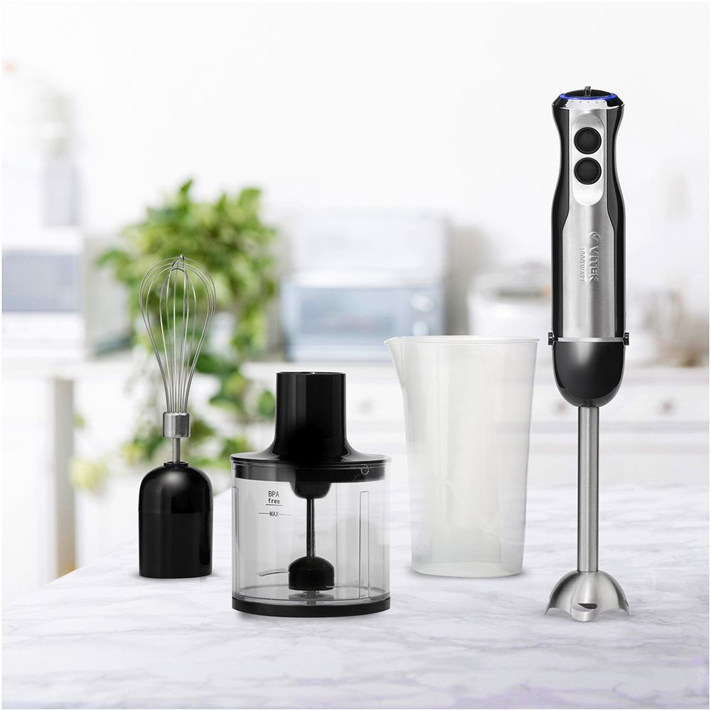 Идеально справиться со смешиванием или измельчением ингредиентов блюда способен погружной блендер VITEK VT-8543. В комплект к нему входят чаша объемом 500 мл, высокий стакан объемом 600 мл и насадка-венчик. Отличительной особенностью блендера является плавная регулировка 6-ти предусмотренных в приборе скоростей. А для самых сложных случаев в нем имеется режим TURBO, который легко справится даже с самыми твердыми ингредиентами. Нельзя не отметить и необыкновенный комфорт в эксплуатации устройства, который обеспечивает световой индикатор работы прибора — красивая LED-подсветка.