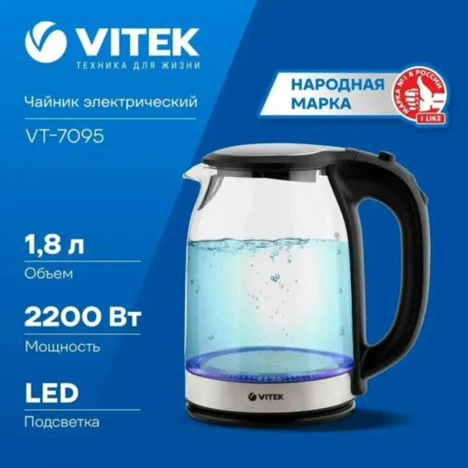 Чайник VITEK VT-7095 – это отличный повод собрать за чашкой чая всю семью. Он поможет вам не только приготовить чай, но и создать на кухне по-настоящему уютную атмосферу благодаря своему прозрачному корпусу из термостойкого стекла с красивой внутренней подсветки. Чайник легок в уходе: его внутреннюю поверхность очень просто очищать за счет скрытого нагревательного элемента. Автоматическая крышка открывается одним нажатием кнопки – и это делает использование VITEK VT-7095 еще более простым и удобным.