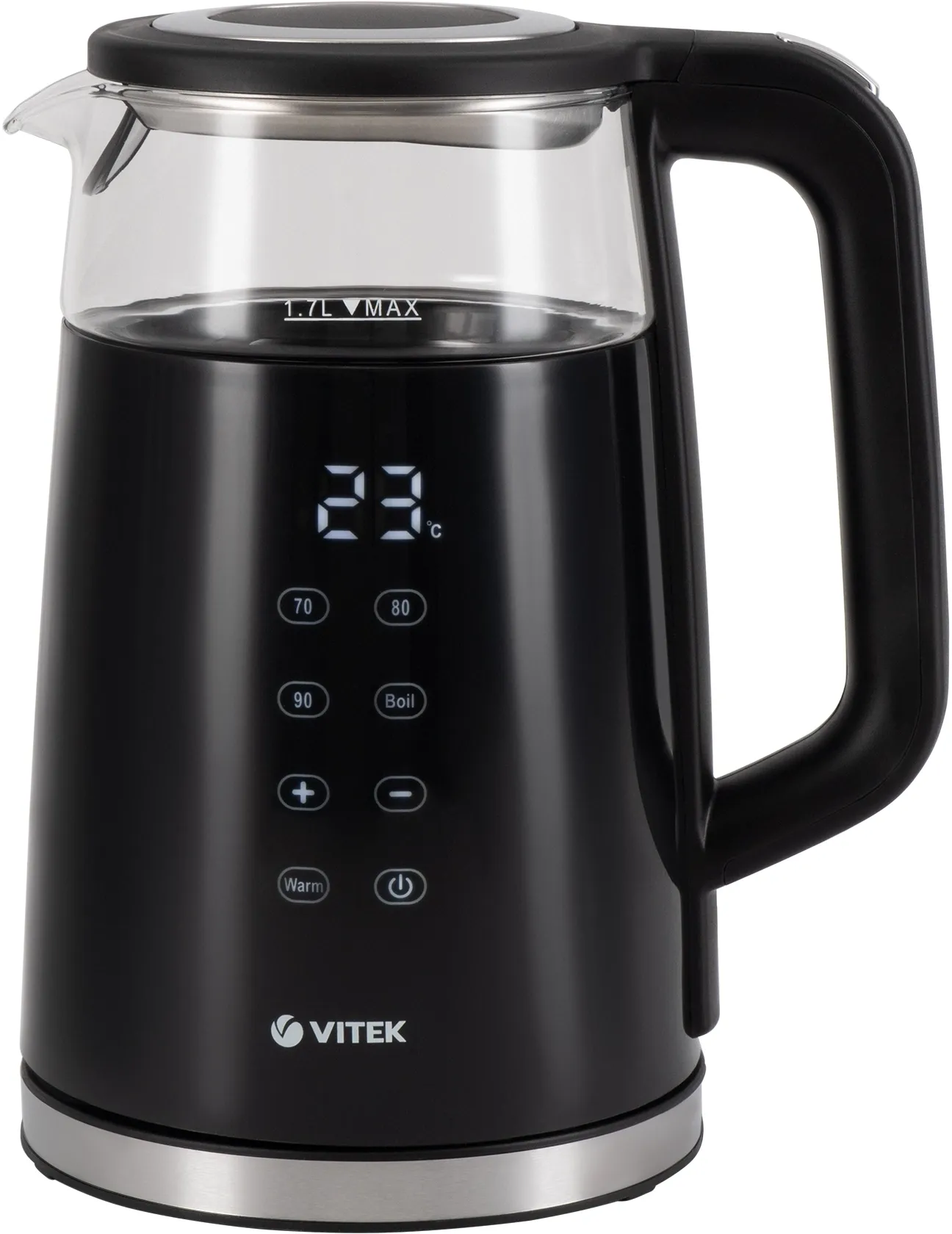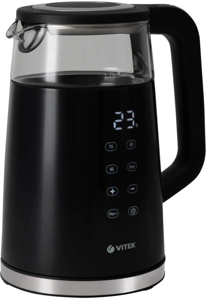 Стильный чайник VT- 8827 с корпусом из термостойкого стекла и высококачественного пластика станет одним из самых желанных аксессуаров на вашей кухне. Благодаря технологии Cool touch он абсолютно безопасен в работе: поверхность не нагревается в процессе кипячения воды! В чайнике предусмотрено 4 режима подогрева —70°С, 80°С, 90°С,100°С, а также функция поддержания температуры (до 2 часов). Тринадцать режимов регулировки температуры нагрева воды от 40°С до 100°С позволят заваривать кофе, зеленый, белый чай или приготовить детское питание водой правильной температуры. Благодаря электронному контролю нагрева и остывания воды с инновационной индикацией температуры на фронтальной части корпуса Вы с идеальной точностью добьетесь нужной температуры воды для приготовления любимых напитков. В чайнике VT-8827 три степени безопасности: защита от перегрева, автоматическое выключение при закипании и отсутствии воды.