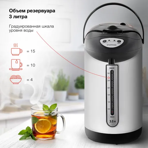 Термопот Starwind STP1130 оснащён скрытым нагревательным элементом, который обеспечивает быстрый нагрев воды и поддержание заданной температуры. Также имеется функция повторного кипячения и защита от перегрева.