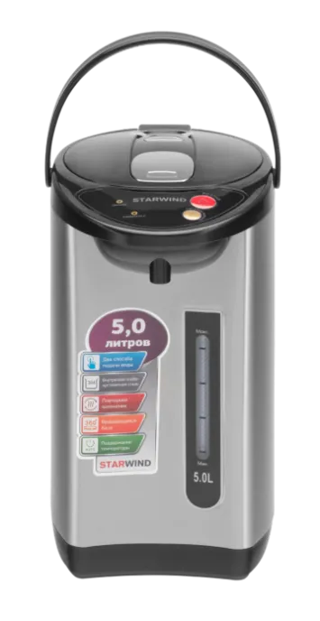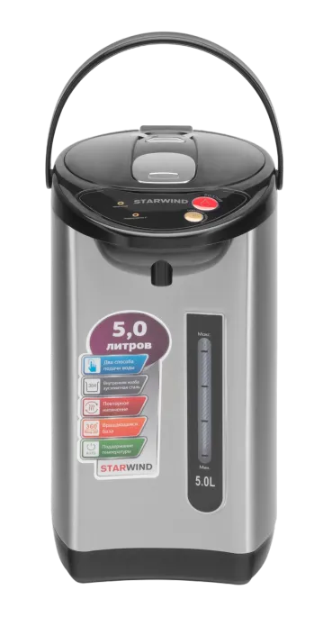 Термопот Starwind STP2251 — это стильное и функциональное устройство для нагрева и поддержания температуры воды. Объём резервуара составляет 5 литров, а мощность — 750 Вт. Термопот выполнен в чёрном и серебристом цветах из ударопрочного пластика.