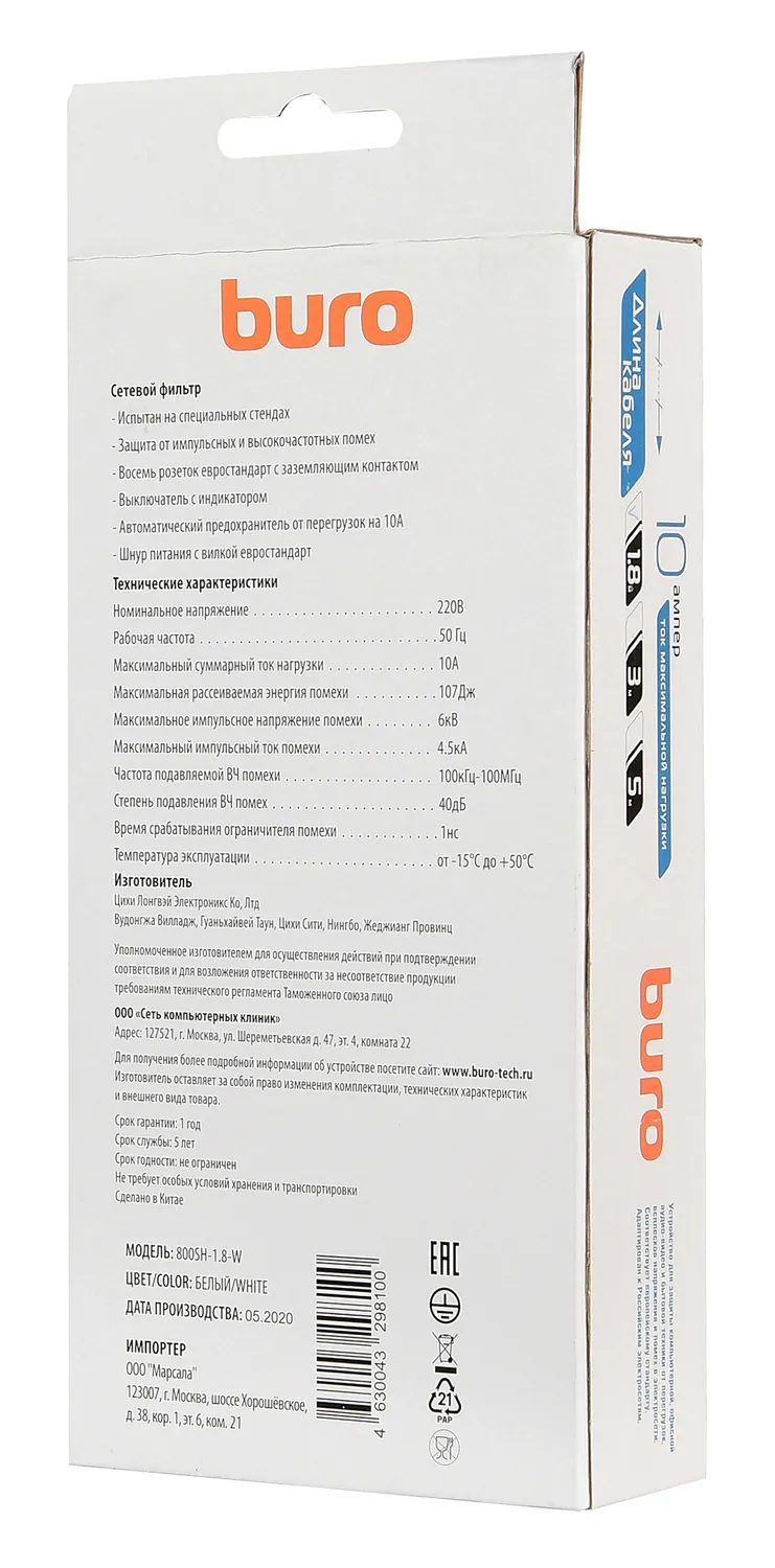 Сетевой фильтр Buro 800SH-1.8-W — это надёжное устройство с восемью розетками типа EURO, которое обеспечивает защиту электронных устройств от перепадов напряжения и электромагнитных помех. Благодаря длине кабеля 1,8 метра и белому цвету корпуса, этот сетевой фильтр станет отличным дополнением к вашей технике.