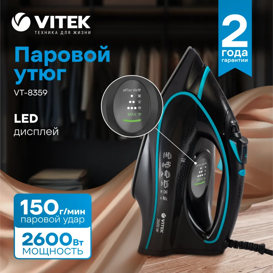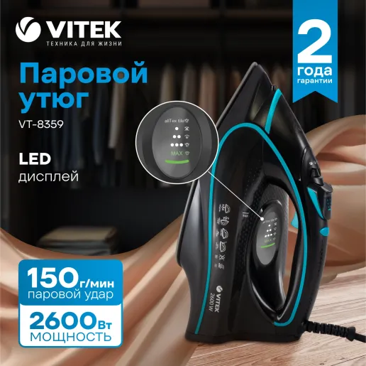 Идеально отгладить одежду позволит стильный утюг VITEK VT-8359 с номинальной потребляемой мощностью 2600 Вт. Прибору можно доверить даже самые деликатные ткани, так как его подошва имеет уникальное керамическое покрытие UniCera, обеспечивающее сверхлегкое скольжение. Информация о выбранном режиме отражается на удобном LED-дисплее. Помимо сухого глажения с режимом разбрызгивания, в утюге имеется удобная функция вертикального отпаривания (максимальный паровой удар — 150 г/мин). Объем резервуара для воды — 450 мл. Благодаря функции «антикапля», системе самоочистки и встроенной защите от накипи, пользоваться утюгом невероятно комфортно. К тому же устройство отключается автоматически, если его оставить без движения.